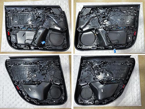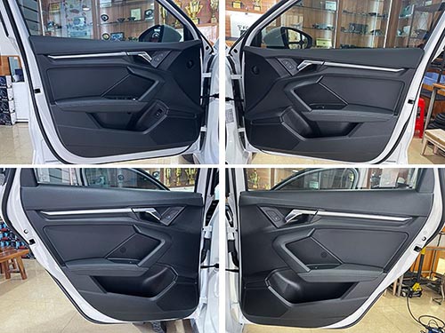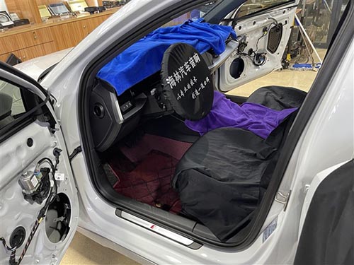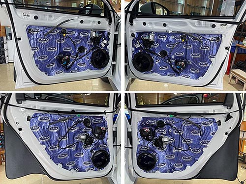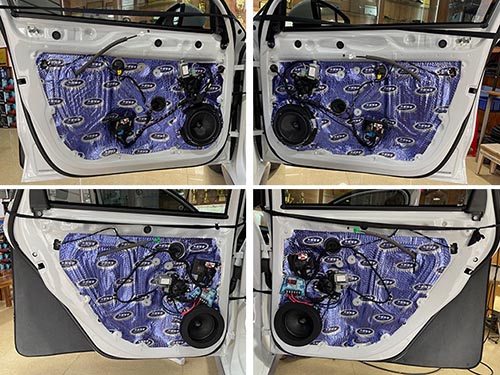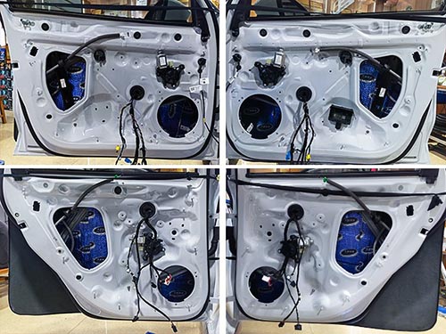 要想音質得到整體的提升,細節方面的處理也十分重要。四門隔音對于音響改裝來說,是必不可少的一步,專業的的隔音施工能使得門板形成一個良好的音響箱體,可以提升中低頻的音響效果。使用四門大能藍金剛及吸音棉對門板進行三層隔音降噪施工,增強鈑金剛性同時也為喇叭提供一個良好的發聲環境。