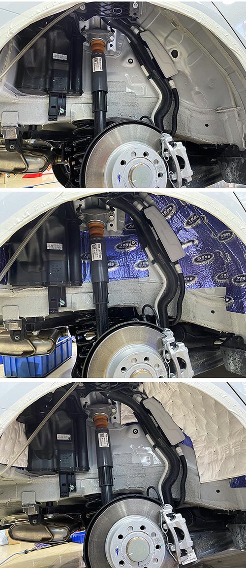 汽車行駛產生的路噪和胎噪也不容忽視,為此改裝師使用大能藍金剛隔音材料對輪弧做雙層隔音處理,這就相當于切斷了路噪和胎噪傳播途徑,阻止路噪和胎噪傳入。致力為車主打造一個安靜舒適的聽音空間!