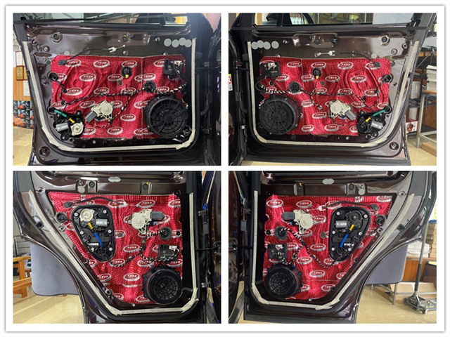 前后門板先使用大能紅派進行內(nèi)層的第一層隔音,粘貼材料較為講究,令鈑金與隔音材料直接緊密貼合,加強鈑金的剛性,減少共振