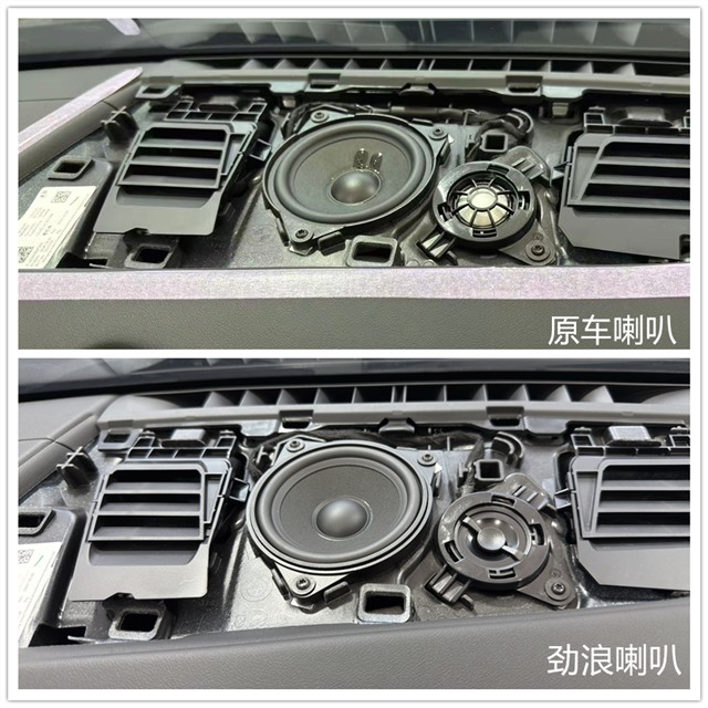 前后聲場,我們統一升級勁浪 IS BMW 100L 兩分頻。它和前面提到的 IS BMW 100 同屬勁浪寶馬專用系列,但“L”版本針對門板安裝做了優化,喇叭靈敏度更高,中低頻更扎實,聲音下潛更有力。安裝完成之后最明顯的感受就是:聲音更有“包圍感”了。原車門板喇叭聽起來干癟、不夠有厚度,而升級后低頻量感明顯增強,鼓聲、貝斯都能“打”在身上,而且不會糊,層次清晰,聽久也不累。