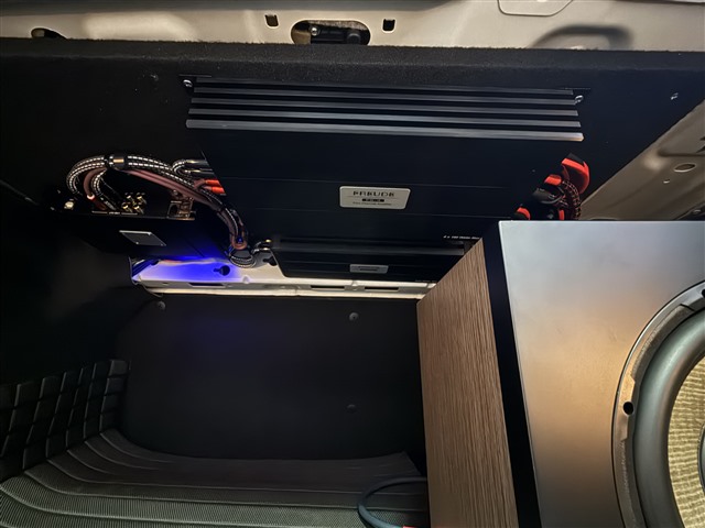 低音部分換裝勁浪 p25 FE BOX 亞麻盆 10 寸原廠箱低音,低頻下潛更深、力度更足,為音樂增添飽滿的氛圍感;功放方面,新增弗萊德 FS-4 和弗萊德 FD-1 兩臺功放,分別專門推動前后聲場喇叭和低音,確保每一套喇叭都能獲得穩(wěn)定充足的功率供給,發(fā)揮最佳性能。兩臺功放被巧妙吊裝于尾箱頂部,這種安裝方式不僅節(jié)省了尾箱空間,不影響日常儲物使用,還能有效散熱,保證功放的穩(wěn)定運行;勁浪 10 寸原廠箱低音則平穩(wěn)放置于尾箱,不占用過多空間,兼顧了實用性與音質(zhì)表現(xiàn)。