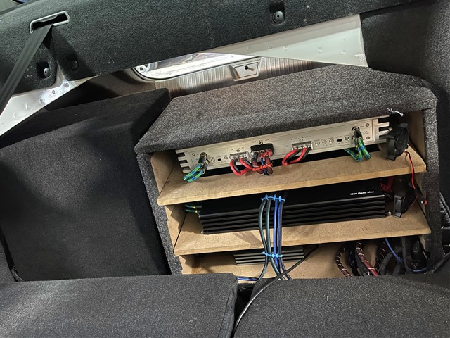在營造出具有感染力的音樂氣氛的同時,為讓音樂更具激情和震撼力,勁浪烏托邦10寸超低音功不可沒。這款超低音被安裝在尾箱,小體積不僅節省了空間,還展現出美觀的一面。同樣地,尾箱內還隱藏安裝了用來推動前后聲場的詩芬尼MA130.4功放和推動超低音的弗萊德FS-1單路功放。整齊的布局設計讓整個尾箱看起來十分簡潔。