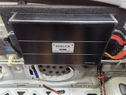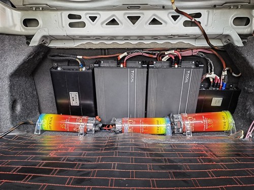 兩臺法國勁浪AP4340功放驅動前聲場6只喇叭,做主動分頻;尾箱安裝兩只法國勁浪SUB 30A4箱體低音炮,用兩臺弗萊德FD—1D功放來驅動,有精準的低頻控制力,大體積低音下潛深度充沛而且彈性十足,非常震撼。通過合理的安裝布局,器材雖多,但絲毫不會有雜亂的感覺。