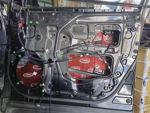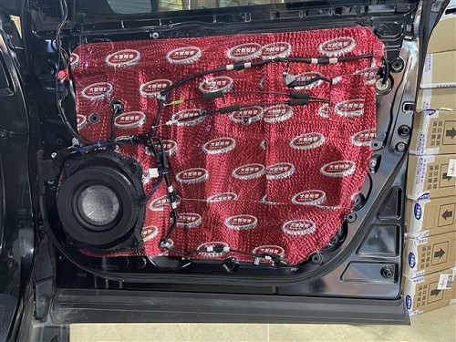 四門用的隔音材料是大能紅派,改裝師先對門板內層進行減震,粘帖隔音材料后,門板可以變得厚實,也無形之中增加鈑金剛性。外層做第二層隔音材料粘貼,加強門板隔音降噪,為中低音營造一個發音的箱體效果。
