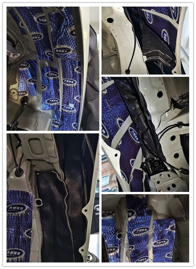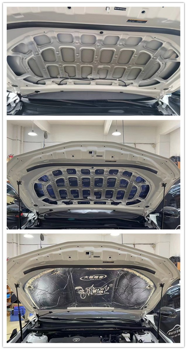 我們的汽車引擎蓋是離發(fā)動機的距離最近的,發(fā)動機工作時就會不斷引起周邊金屬的振動,然后將噪音進行傳遞,熱量的產(chǎn)生也會對引擎蓋進行烘烤,導(dǎo)致漆面老舊,影響漆面的美觀。所以改裝師使用大能藍金剛做第一層止振的基礎(chǔ),再貼上銀衛(wèi)士作為第二層,有了銀衛(wèi)士的加入,讓隔音隔熱產(chǎn)生立竿見影的效果。