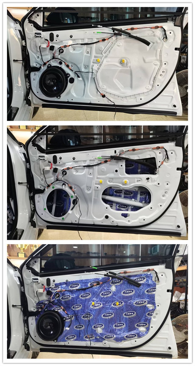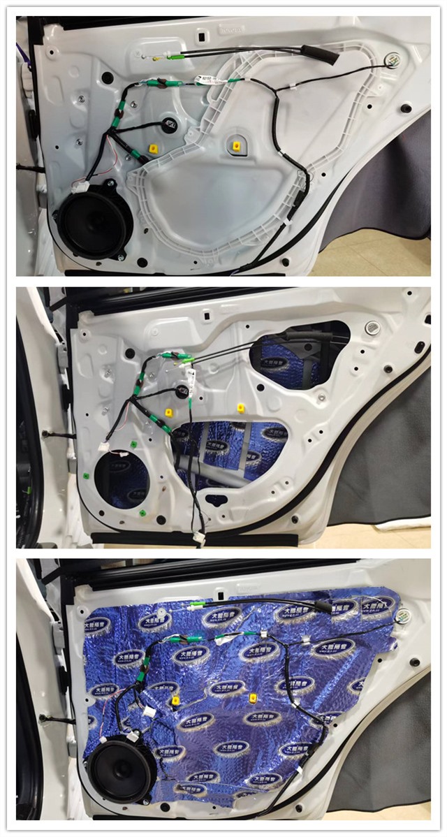 汽車行駛產(chǎn)生的胎噪主要通過輪弧等部位傳入到車廂內(nèi)部,因原車輪弧同其他部位一樣,并未做任何的隔音處理,這意味著胎噪可以輕而易舉的傳入到車廂內(nèi)部。針對胎噪的問題,一共使用了三種材料,分別是大能藍金剛、噪音終結(jié)者、超級溫莎可以非常有效的減少胎噪向車內(nèi)的傳遞。
