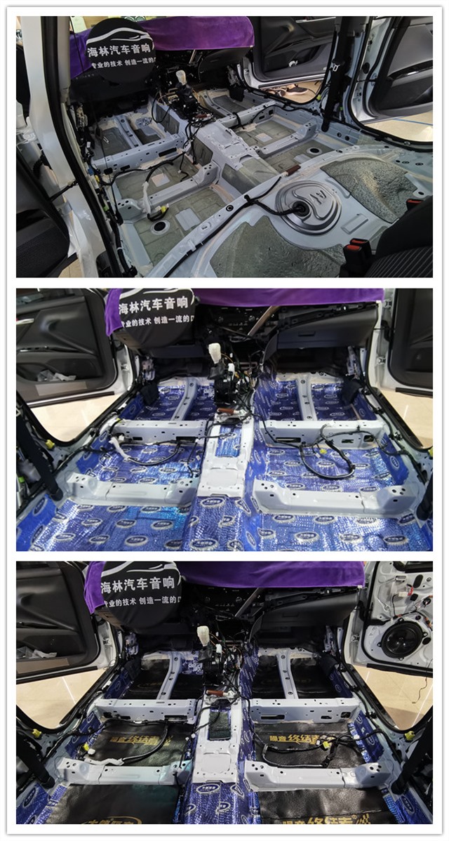 原車底盤、底盤第一層大能藍金剛隔音和第二層噪音終結(jié)者隔音流程展示