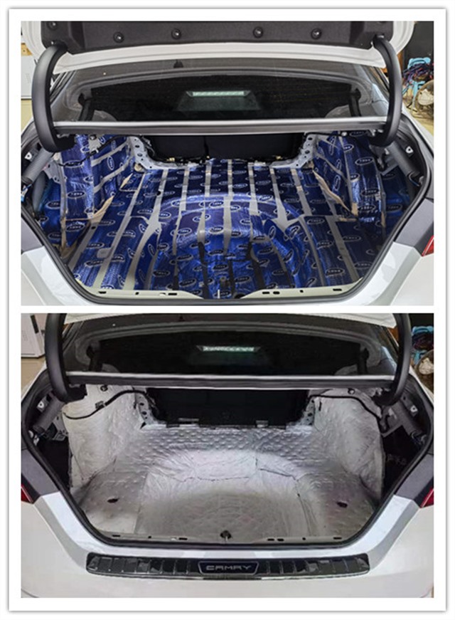 由于尾箱是后輪轂噪音和排氣噪音的主要通道,通過尾箱會傳入大量的噪音及燥熱。而豐田凱美瑞的原車尾箱沒有任何的隔音處理,薄弱的鈑金更容易將噪音傳遞到駕駛室,長時間的震動也會導(dǎo)致尾箱的鈑金強度下降,所以使用大能藍金剛進行第一層止震處理,將材料均勻地粘貼在鈑金表面,增加鈑金厚度,抑制鈑金振動,最后使用超級溫莎,吸收尾箱及輪轂部分的各類高頻噪音。