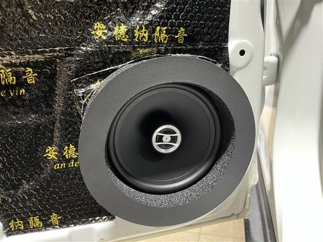 勁浪RCX-165同軸喇叭也是用常見的原位安裝方式安裝,既可以保證喇叭性能的正常發揮,也可以滿足車主不愿意改動原車門板的想法。為了增強音質效果,同樣也在同軸喇叭外圍加裝了美音圈,有效地減少喇叭側向傳播的聲波,使得喇叭側向的聲波不會在門皮飾板內形成駐波而污染聲音的清晰度,減少門皮飾板的震動。