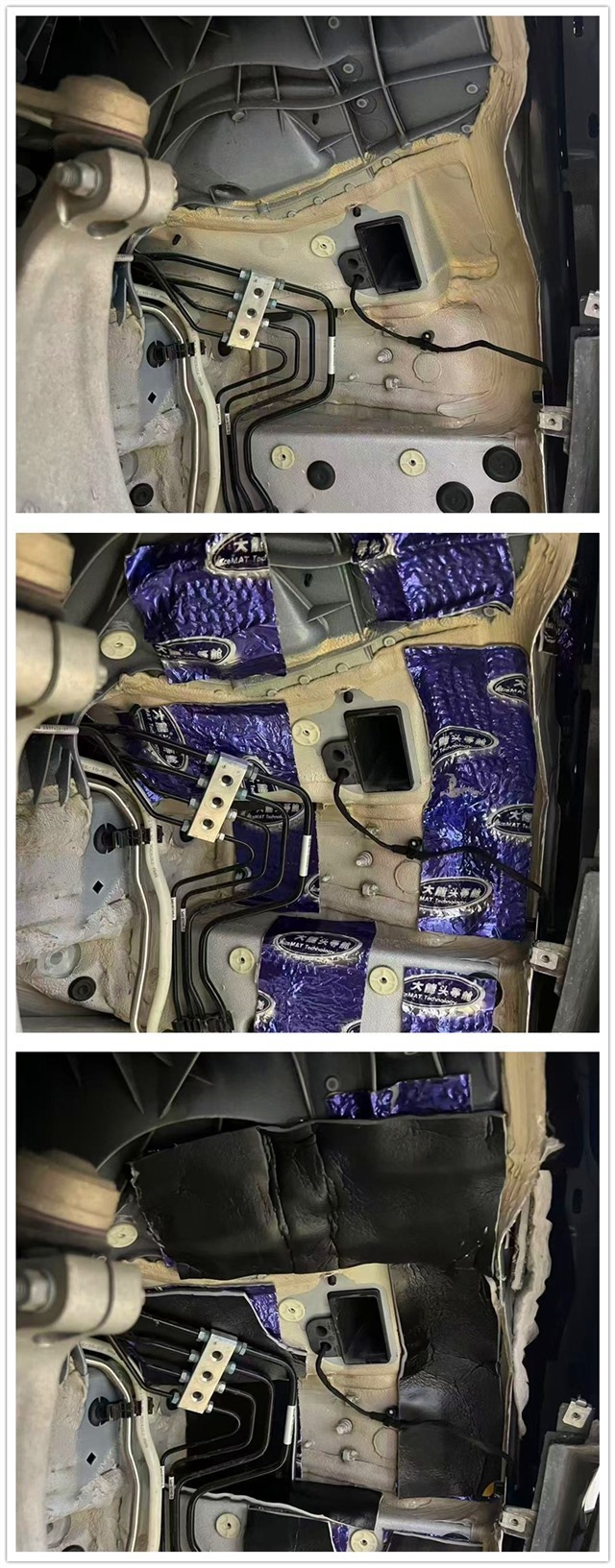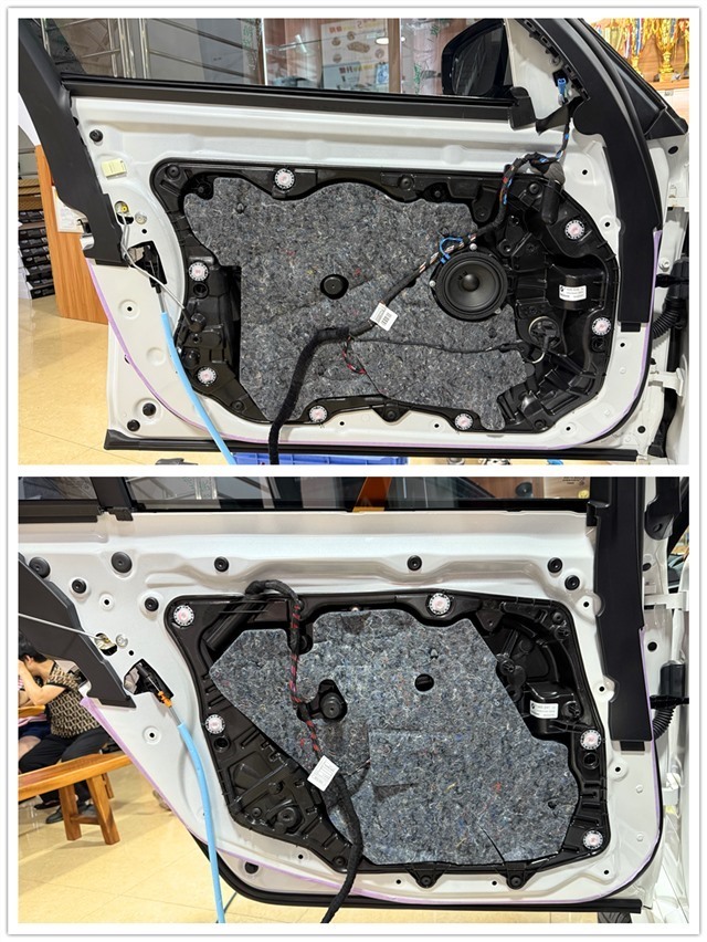 粘貼隔音材料前,將前后門板的鈑金表面徹底清潔干凈,確保粘貼效果