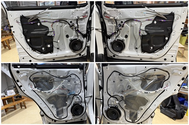 原車門板僅有一層薄弱的防水膜,無法抑制振動和噪音。我們將其清除后,使用GT隔音材料進行了標準的三層隔音處理,完成第二層隔音時,我們還將勁浪喇叭在前后門板進行了原位無損安裝,還加裝了美音圈,使聲音集中起來。