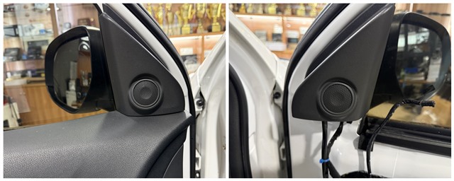 車門三角區(qū)經(jīng)過精準(zhǔn)倒模,嵌入勁浪ASE-165高音喇叭。此舉不僅提升聲場(chǎng)高度,使音像定位更精準(zhǔn),還與原車內(nèi)飾無(wú)縫融合,保留美觀性。