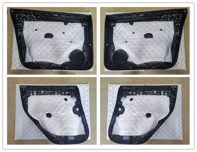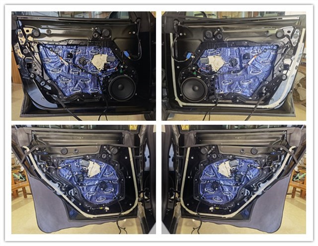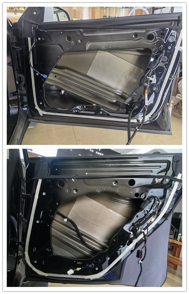 由圖可見,前后門板開始使用大能藍金剛進行第一層隔音處理,可以很大程度增強鈑金的剛性,防止行駛中門板共振并產(chǎn)生噪音。