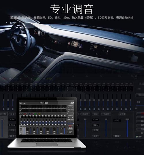 首先,改裝師為前后聲場加裝一臺弗萊德FP-A6V2功放進行驅動。其超薄機身設計使其可以輕松安裝在座椅底下,不占用車內空間。然而,麻雀雖小卻五臟俱全,精密的DSP音頻處理器程序可實現信號輸入到輸出的精準控制,實現精準調諧延時和相位,讓頻段銜接更為順滑自然。具備豐富的輸入輸出選項和可調的增益、相位、延時、EQ等功能,為改裝師提供了更多的調音空間,確保車主能夠享受到最優質的音質。