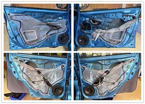 在開始升級前,我們注意到原車門板沒有進行隔音處理,僅有一層塑料膜,容易產生鈑金振動影響音質。因此,我們首先對車門進行了清潔,并使用安德納隔音材料進行雙層隔音處理,有效減少了振動和噪音的影響。