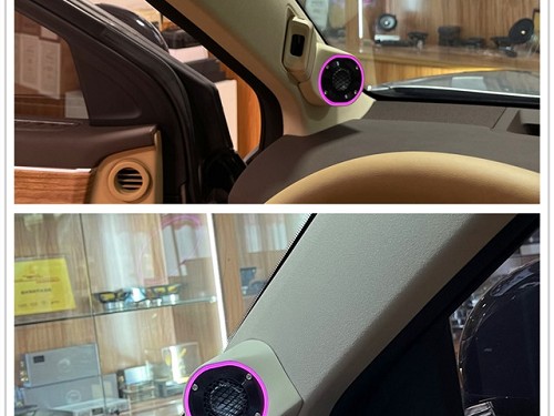 勁浪烏托邦高音喇叭倒模安裝在A柱的整體效果,加上氛圍燈的點綴,車內氛圍感立即拉滿!