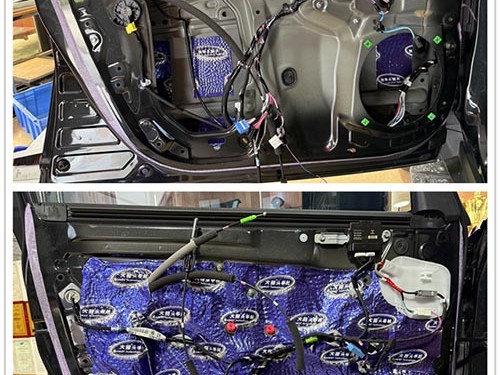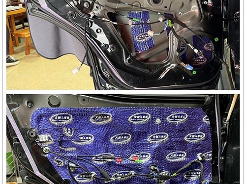 門板飾蓋被拆下后,可見原車門板未做任何隔音處理。因此,為抑制車門的共振與外界噪音干擾,改裝師決定在前后門板上使用了大能藍(lán)金剛進(jìn)行雙層隔音處理。不僅有效減少了車門振動(dòng),還為喇叭的聲音表現(xiàn)提供了更好的聲學(xué)環(huán)境,確保聲音更加純凈。
