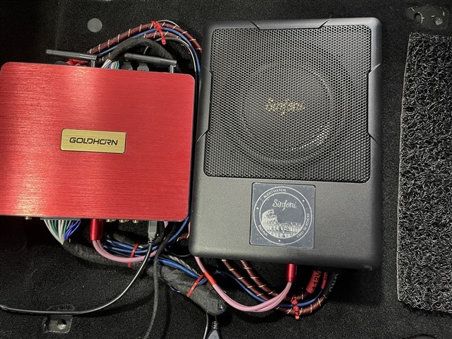 一臺歌航A5 pro音源和一只詩芬尼超薄低音隱藏安裝在座位底下
