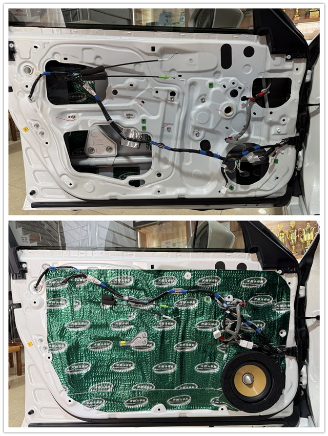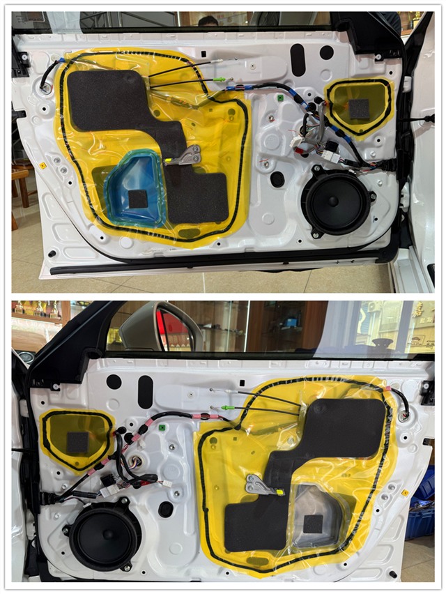 音質(zhì)的提升離不開(kāi)優(yōu)質(zhì)的隔音處理。這次我們采用了大能超級(jí)盾隔音材料,對(duì)門板進(jìn)行了專業(yè)隔音處理。這不僅提升了車內(nèi)的音響環(huán)境,還有效減少了行車噪音,為音響系統(tǒng)的表現(xiàn)提供了更為純凈的空間。