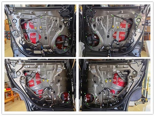 原車門板鐵皮結構拆開后可以看到,門板的隔音措施較少,且有較多的空洞結構,風噪和門板震動的噪音很容易傳入車內。因此,改裝師對門板進行了三層隔音處理。這不僅能降低噪聲,還能增強鈑金剛性。改裝師先用大能紅派對門板進行雙層隔音處理,主要起止振密封作用,再使用超級溫莎對門板飾蓋進行第三層隔音處理。