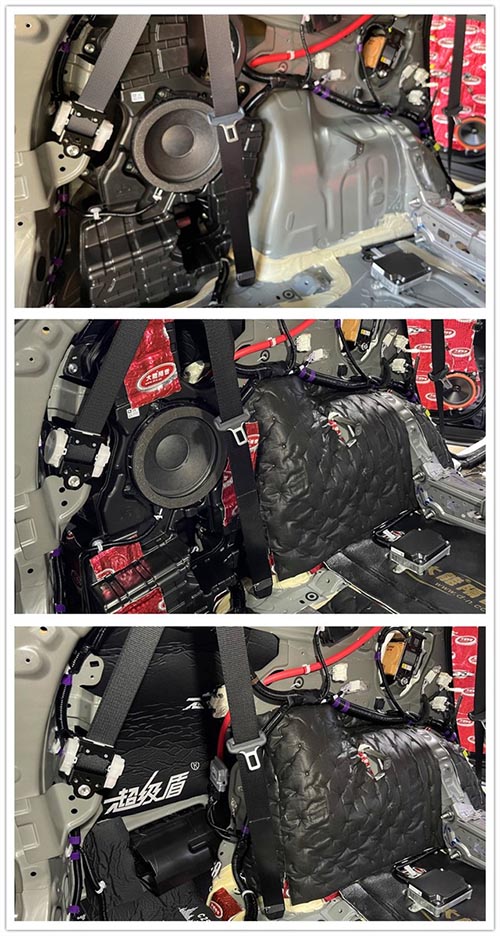后尾箱蓋只是一層單薄的鐵皮結構,在行駛時容易產生振動噪聲。改裝師使用大能隔音材料對后尾箱蓋進行了隔音處理,極大地減少了行車時產生的共振噪聲。