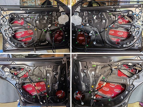 首先采用大能紅派進行車門內外層減振密封處理,其采用最先進的約束性阻尼減振技術,以高純度的丁基橡膠為基層,外覆大能獨有的經過耐磨耐腐蝕鍍膜技術處理的鋁箔,高度穩定不易氧化,具有優異的減振、隔熱、防銹、鈑金強化性能。